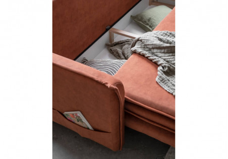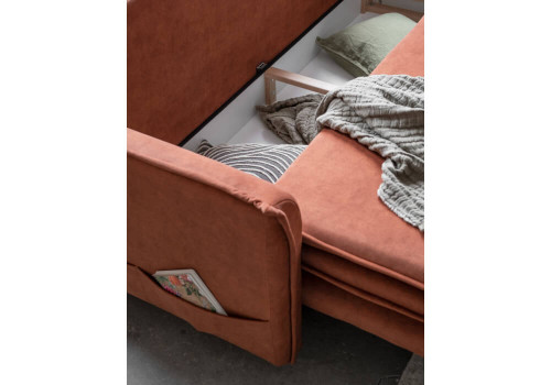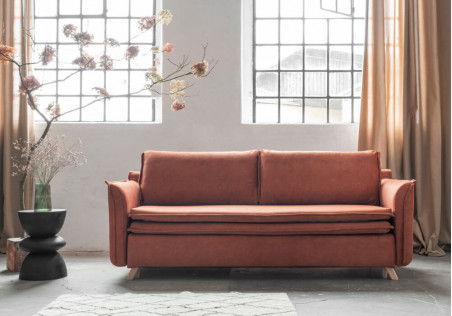 Notre canapé-lit véritablement bohème est fin et léger grâce à l'utilisation de pieds hauts. L'utilisation innovante d'un matelas de surface, qui fait partie intégrante du canapé, assure un confort de sommeil élevé. Des accoudoirs parfaitement équilibrés, un coffre de rangement pour le lit, un siège double confortable doté d'une garniture originale, une poche latérale pour les accessoires en font un canapé vraiment exceptionnel.